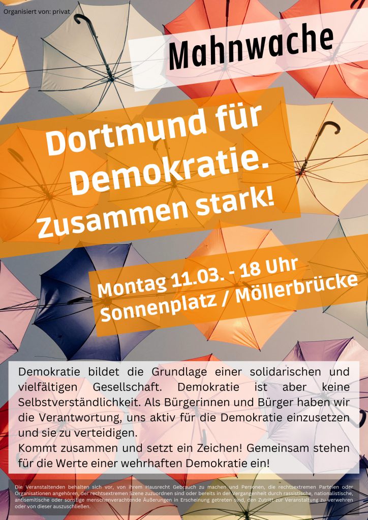 Nach der Ankündigung zahlreicher Mahnwachen in verschiedenen Quartieren und Stadtteilen Dortmunds findet am 11.03. auch im Kreuzviertel eine Mahnwache für Demokratie statt. Um 18 Uhr auf dem Sonnenplatz an der Möllerbrücke zeigt das Viertel, dass es sich entschieden gegen die bekannt gewordenen Deportationspläne der AfD und deren Umfeld stellt und Rechtsextremismus, Antisemitismus und Rassismus eine klare Absage erteilt. Das Kreuzviertel bleibt bunt!