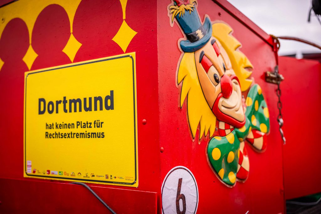 Närrinnen und Narren bekennen Farbe für die Demokratie. Dortmunder Rosenmontagszug hat „kein Platz für Rechtsextremismus“.