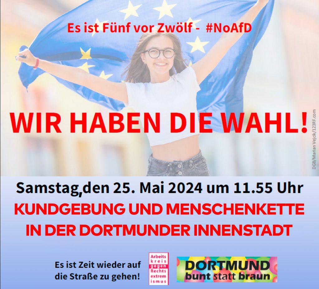 „Wir wollen in Dortmund eine Brandmauer gegen Rechts bauen!“ Mit diesen Worten ruft der Dortmunder Arbeitskreis gegen Rechtsextremismus alle Dortmunder*innen dazu auf, am 25. Mai gegen die AfD und für eine demokratische Stadtgesellschaft auf die Straße zu gehen. Um 11.55 Uhr beginnen wir mit einer Kundgebung und bilden im Anschluss eine Menschenkette durch die Dortmunder City.