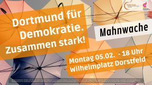 weiterlesenAufruf zur Mahnwache für Demokratie am 05. Februar um 18 Uhr auf dem Wilhelmplatz in Dortmund Dorstfeld. Unter dem Motto „Dortmund für Demokratie – Zusammen stark! ein weiteres Zeichen setzen.
