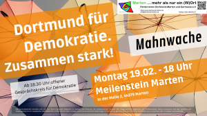 Nach dem großartigen Erfolg der Demo in Dortmund mit 30.000 Menschen und der sehr starken Beteiligung der Mahnwache in Dorstfeld auf dem Wilhelmplatz, findet die nächste Mahnwache für Demokratie am 19.02. in Marten vor dem Meilenstein statt.
