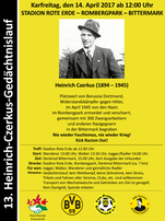 weiterlesenDer Dortmunder Arbeitskreis gegen Rechtsextremismus macht auf folgende Veranstaltung aufmerksam: An den Widerstandskämpfer Heinrich Czerkus (1894-1945) soll der Gedächtnislauf erinnern, der am Karfreitag, 13. April, ab 12 Uhr im Stadion Rot Erde zum 13. Mal stattfindet. Czerkus war Platzwart von Borussia Dortmund und setzte sich gegen Hitler ein. Er wurde im April 1945 von den…